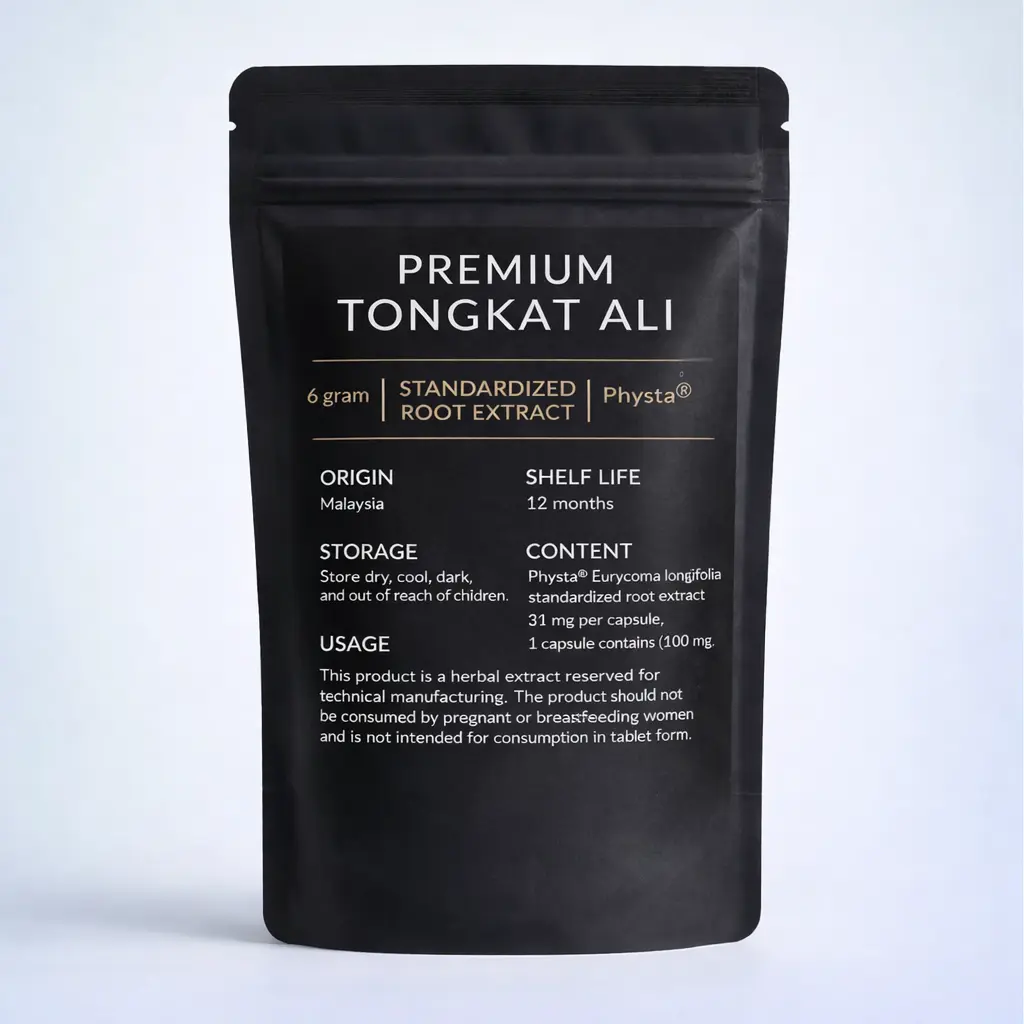 Tongkat Ali Physta® is a standardized root extract of Eurycoma longifolia in powder form, produced through water extraction from raw material originating in Malaysia. The extract is standardized against defined bioactive markers according to the Certificate of Analysis (COA), with eurycomanone serving as a central parameter.